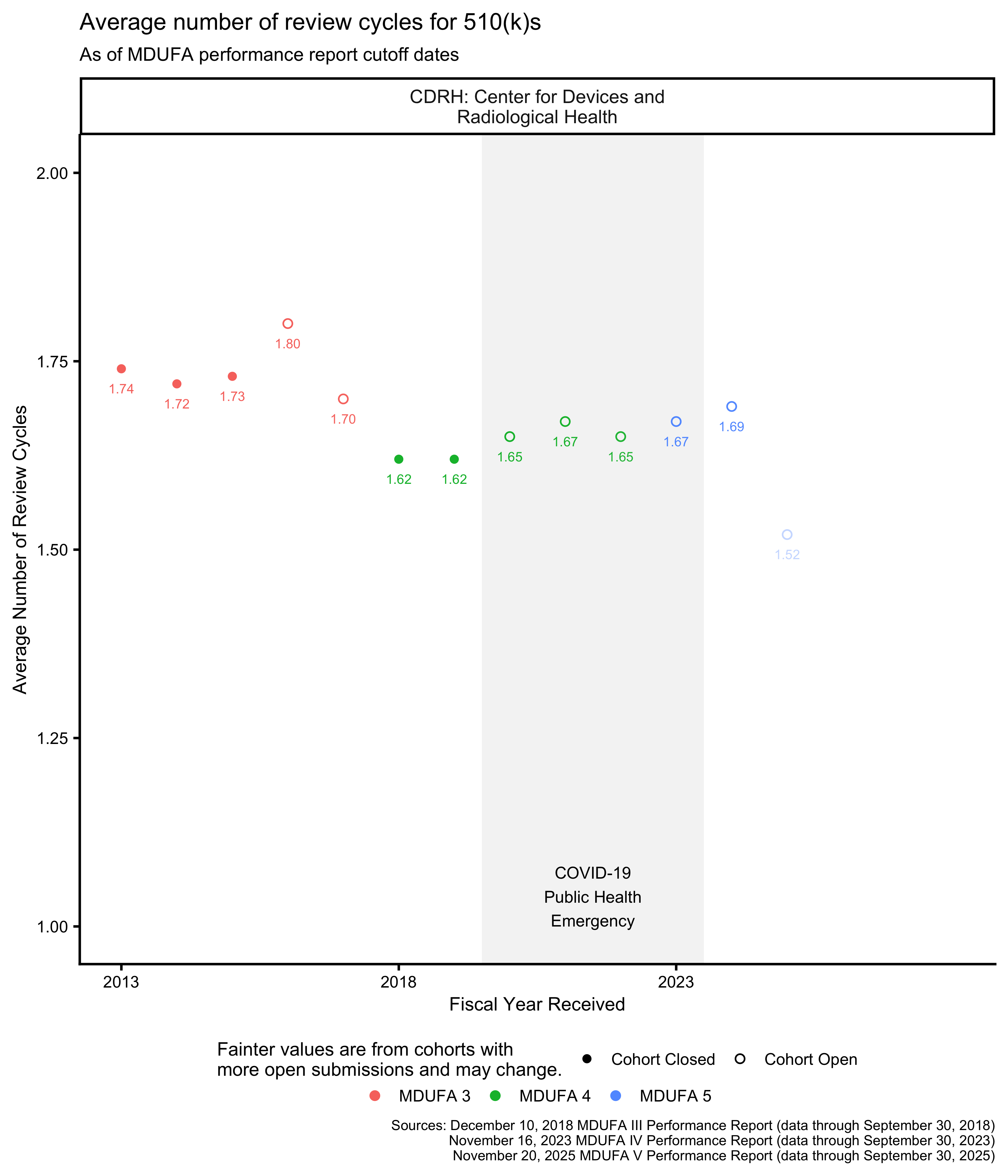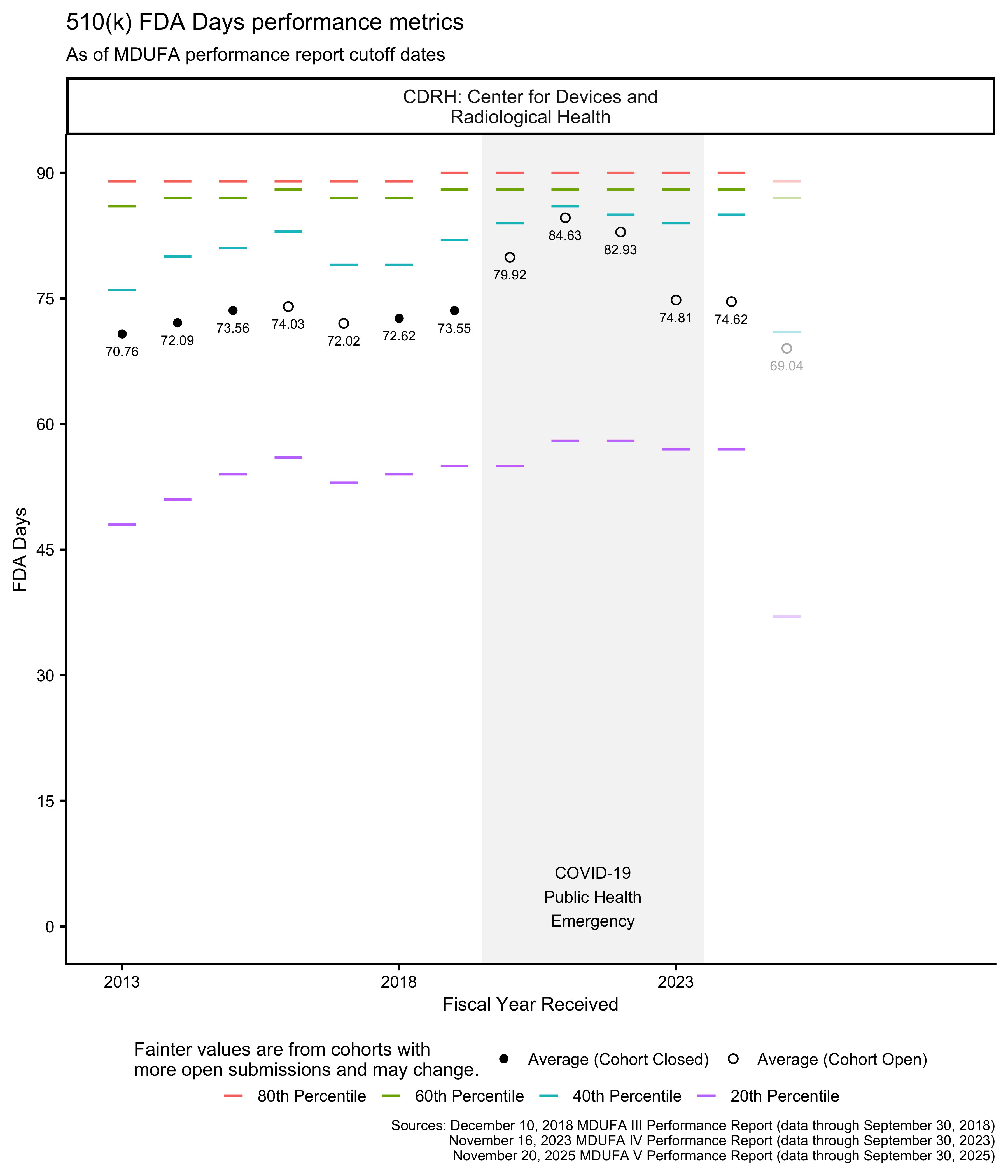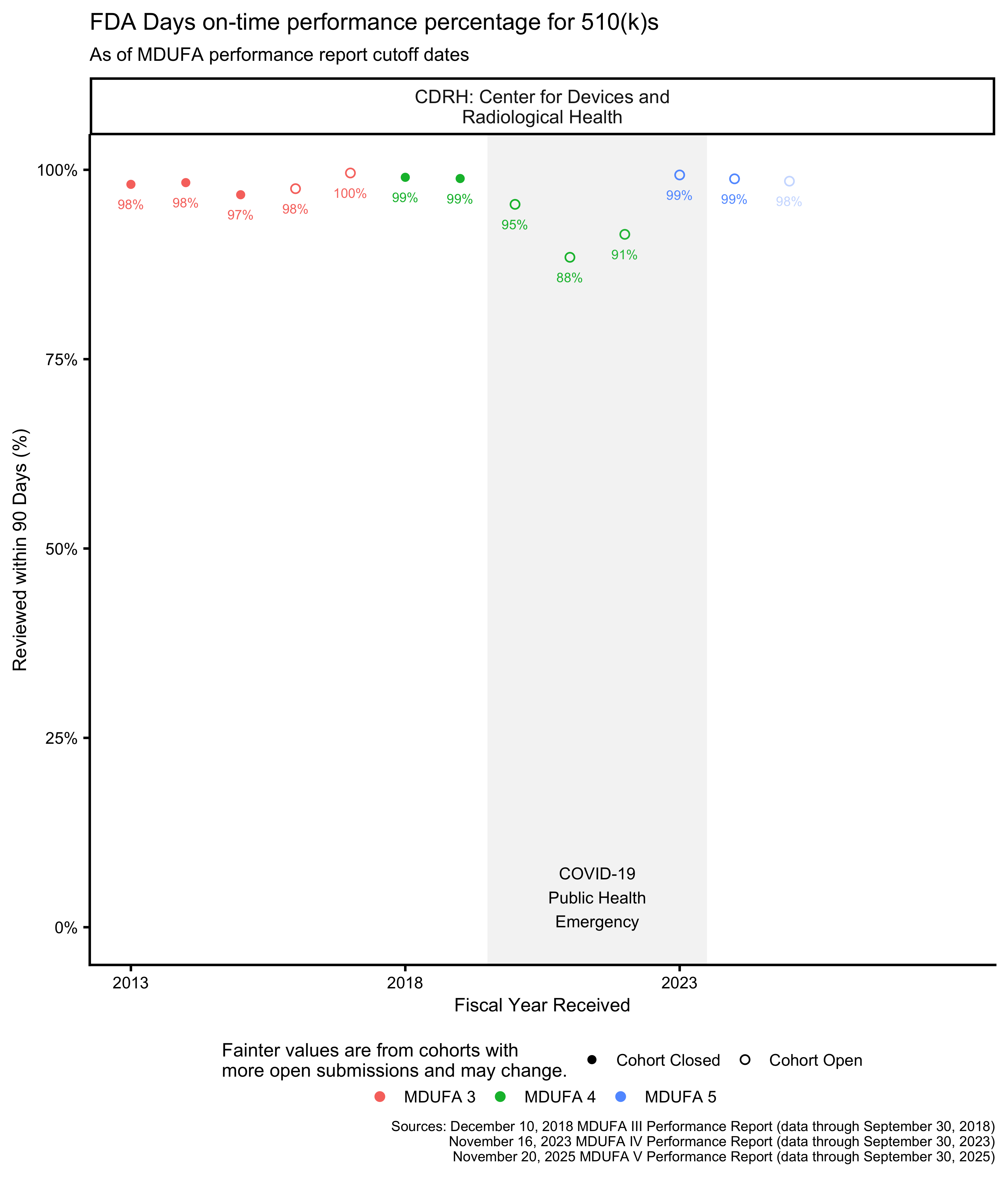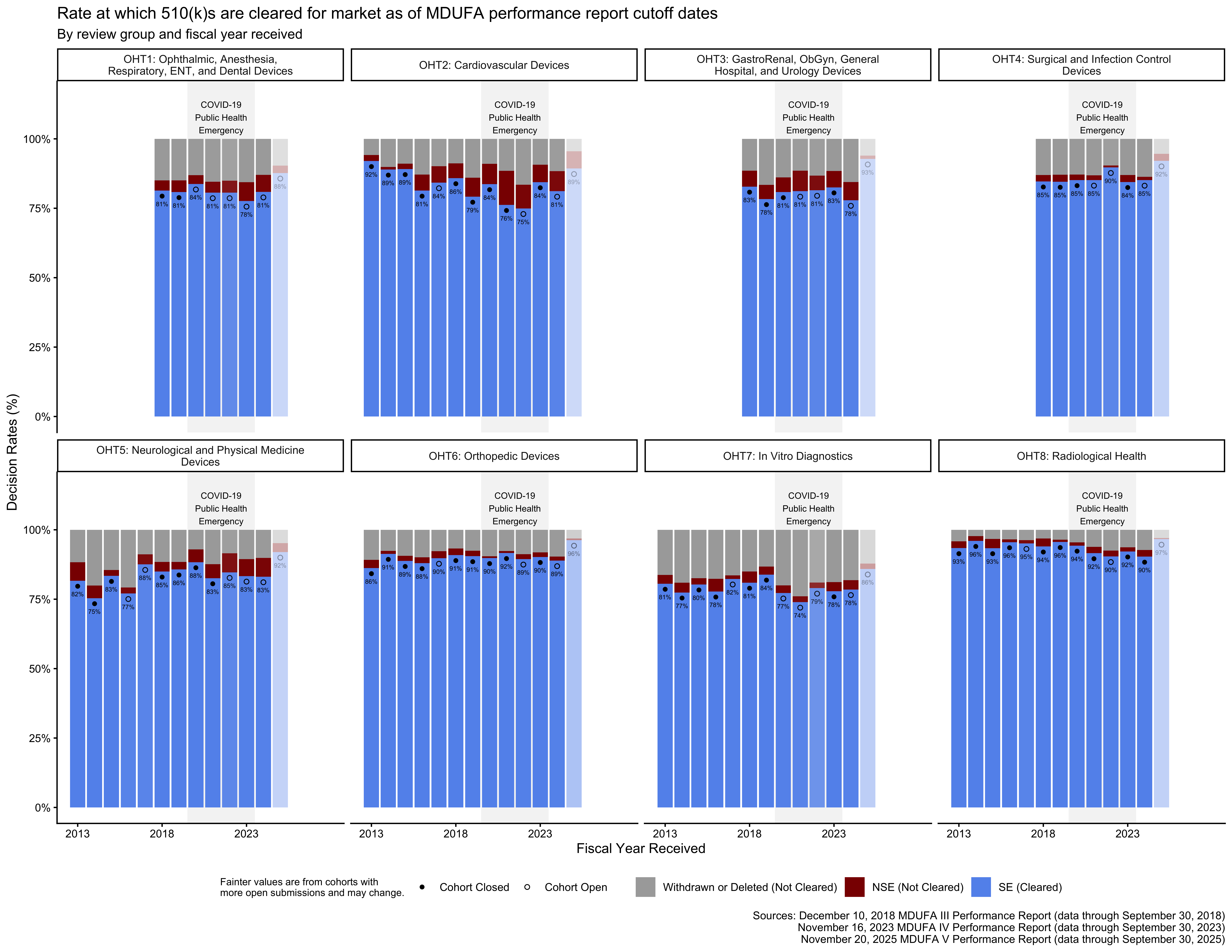As of this writing, the most recent 510(k) receipt cohort includes many submissions for which the FDA has not made a final decision. This means that the receipt cohort is “open.” As review days continue to accumulate for these 510(k)s, the performance metrics that are based on those review times will change as well. Performance metrics calculated across open receipt cohorts continue to change until those cohorts “close,” which happens when each submission in the receipt cohort has received a decision.