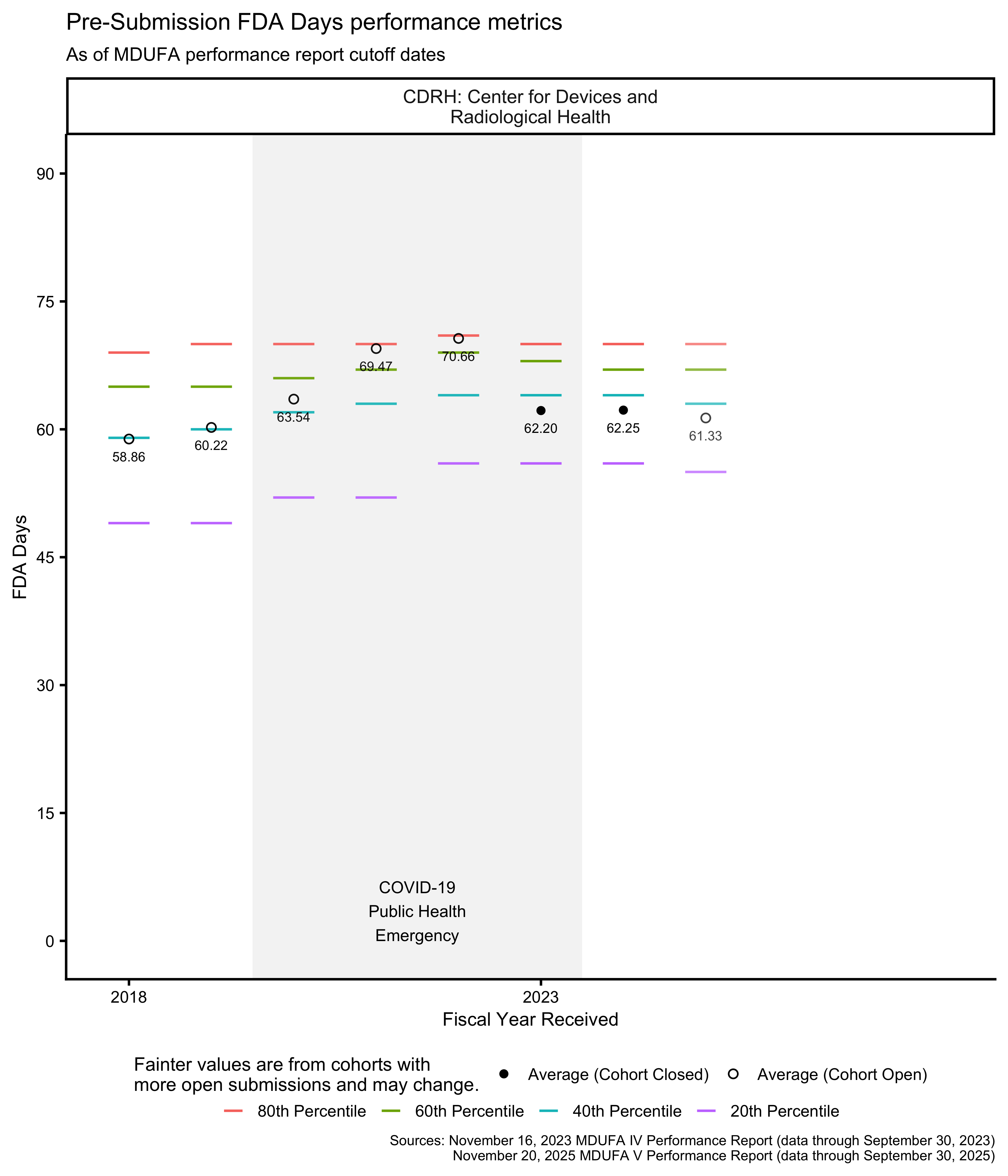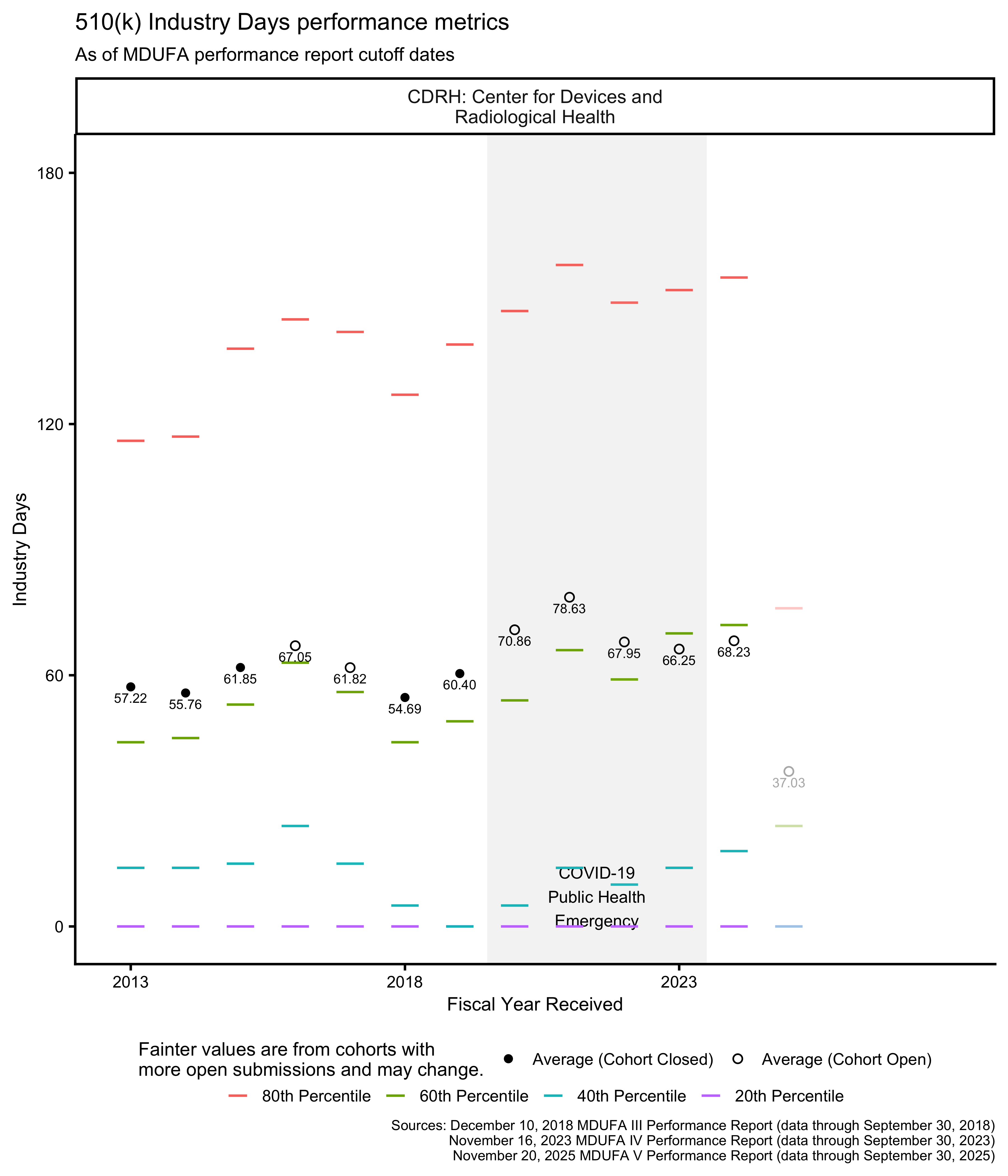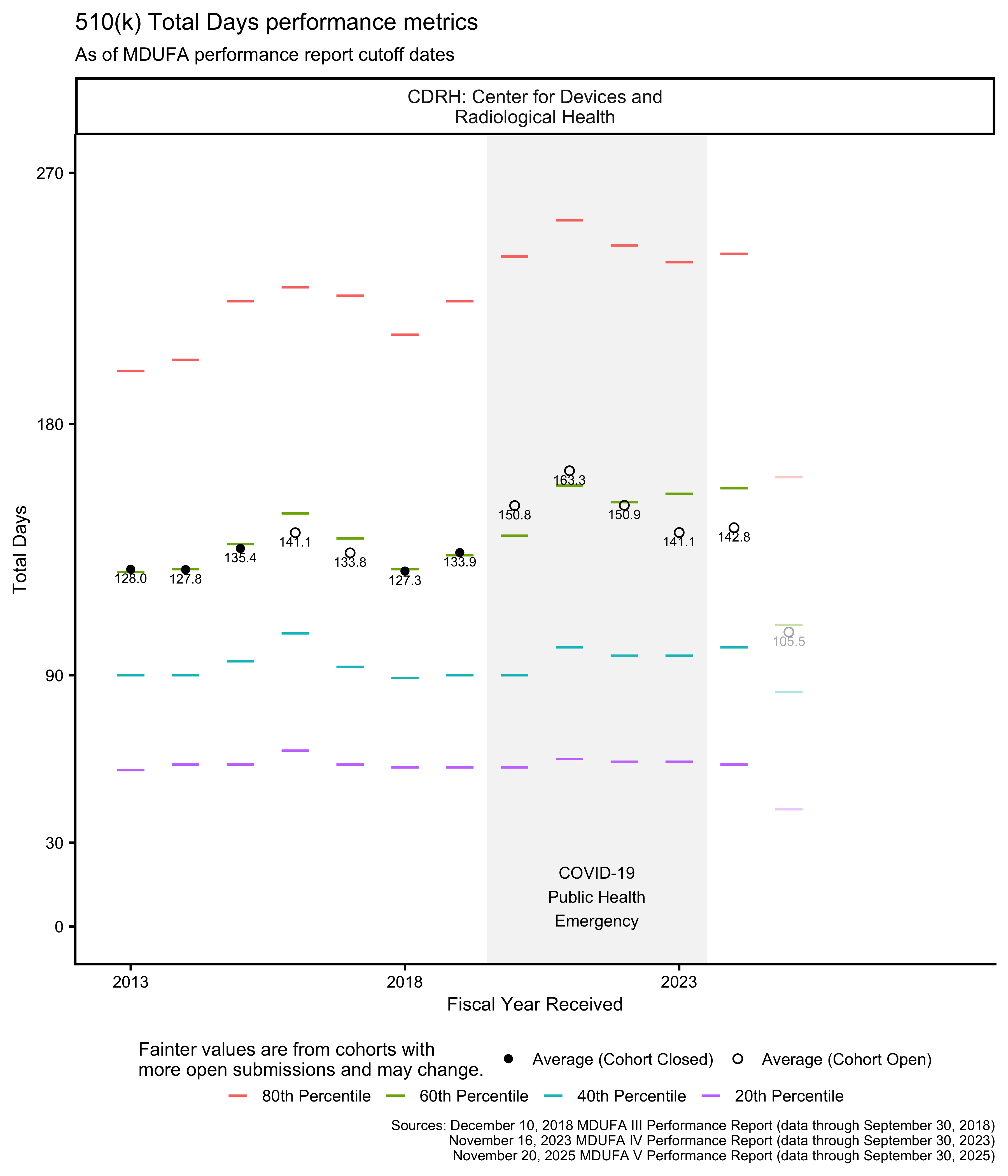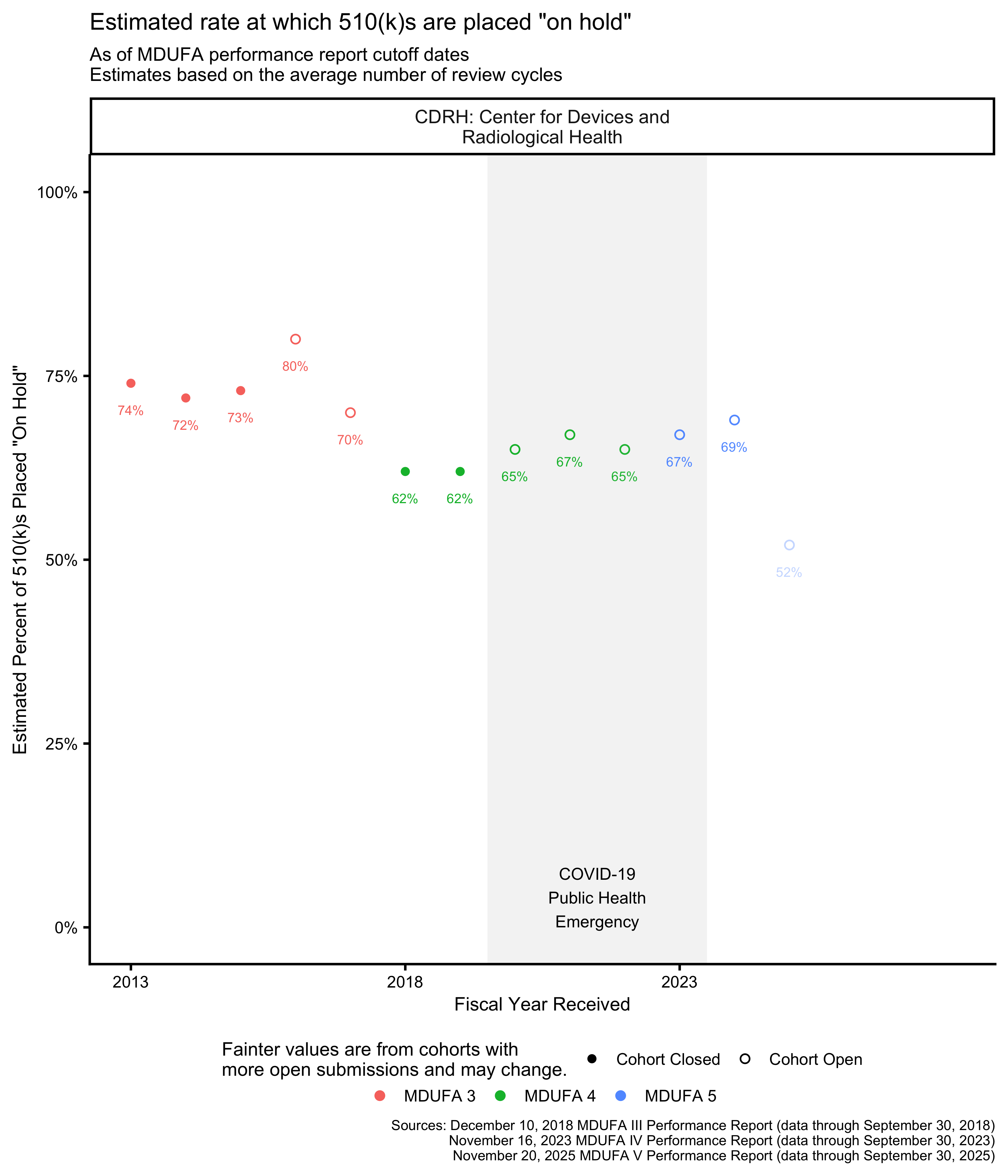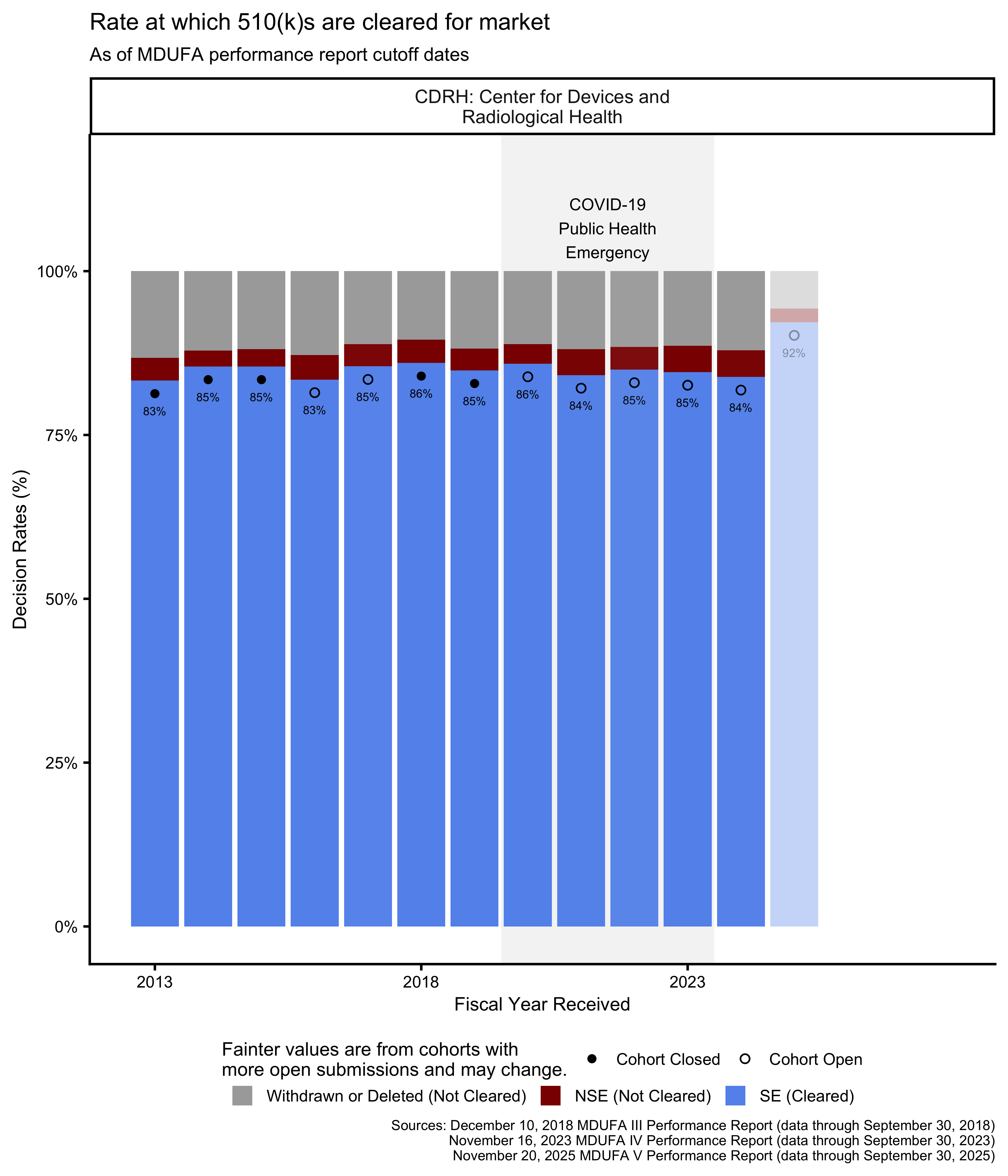 As of this writing, the most recent 510(k) receipt cohort includes many submissions for which the FDA has not made a final decision. This means that the receipt cohort is “open.” As review days continue to accumulate for these 510(k)s, the performance metrics that are based on those review times will change as well. Performance metrics calculated across open receipt cohorts continue to change until those cohorts “close,” which happens when each submission in the receipt cohort has received a decision.