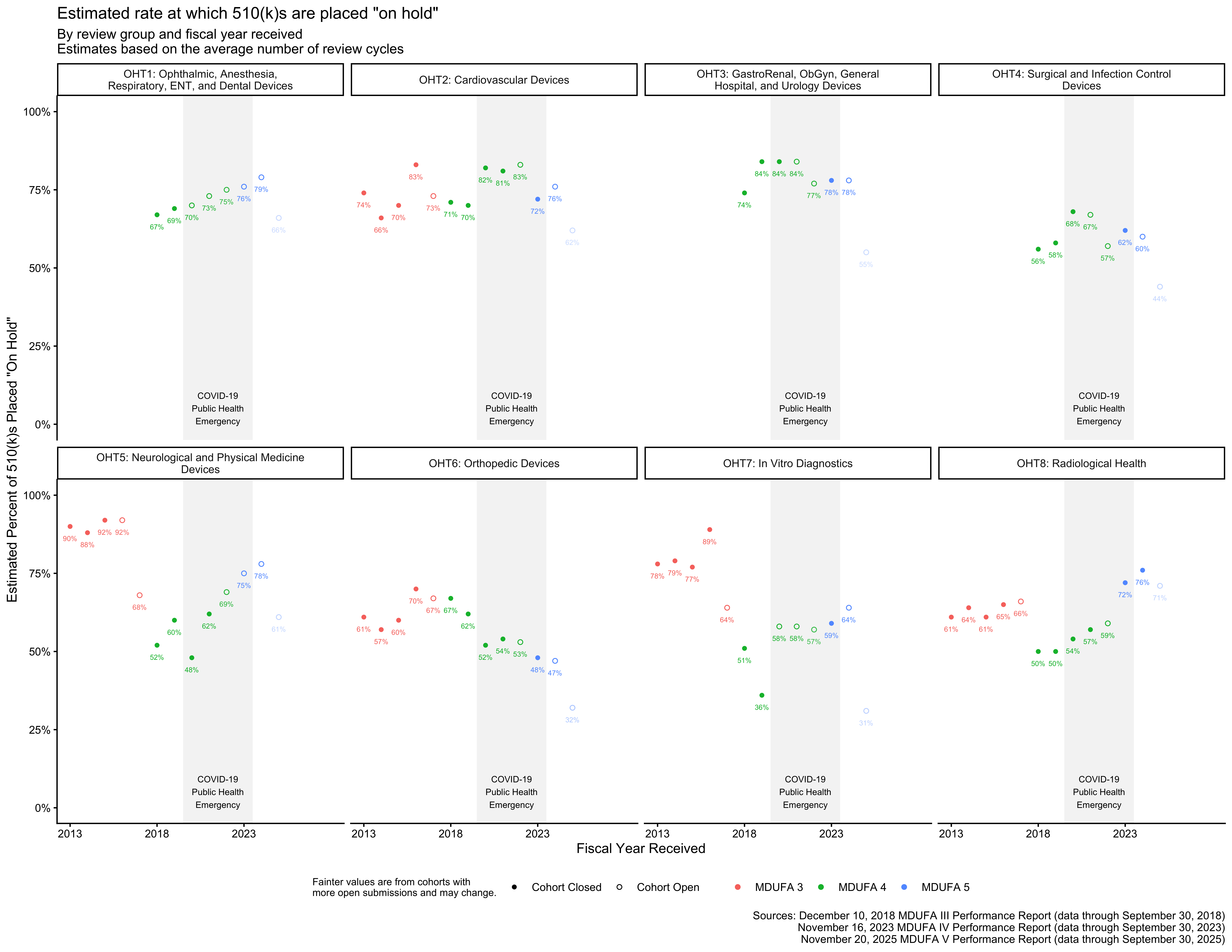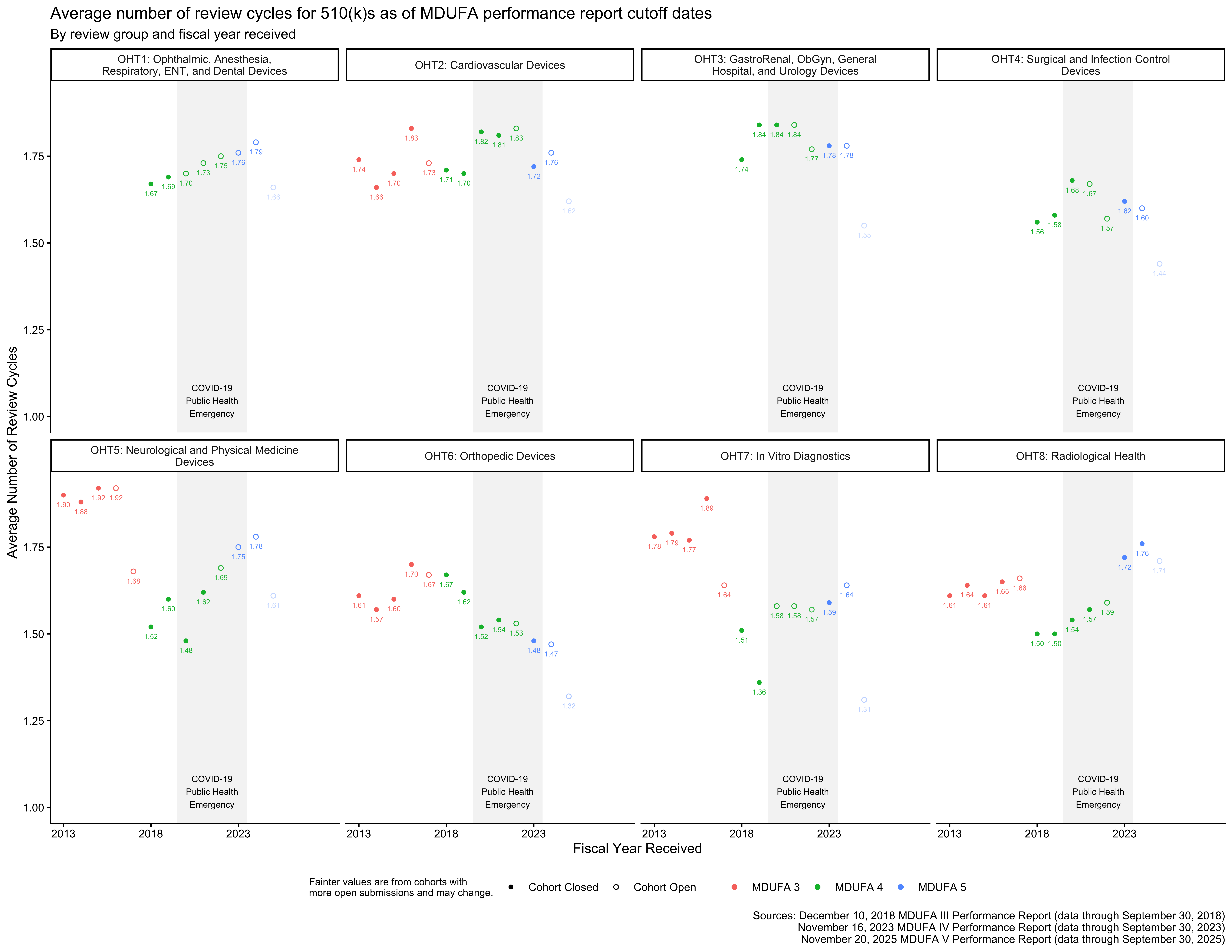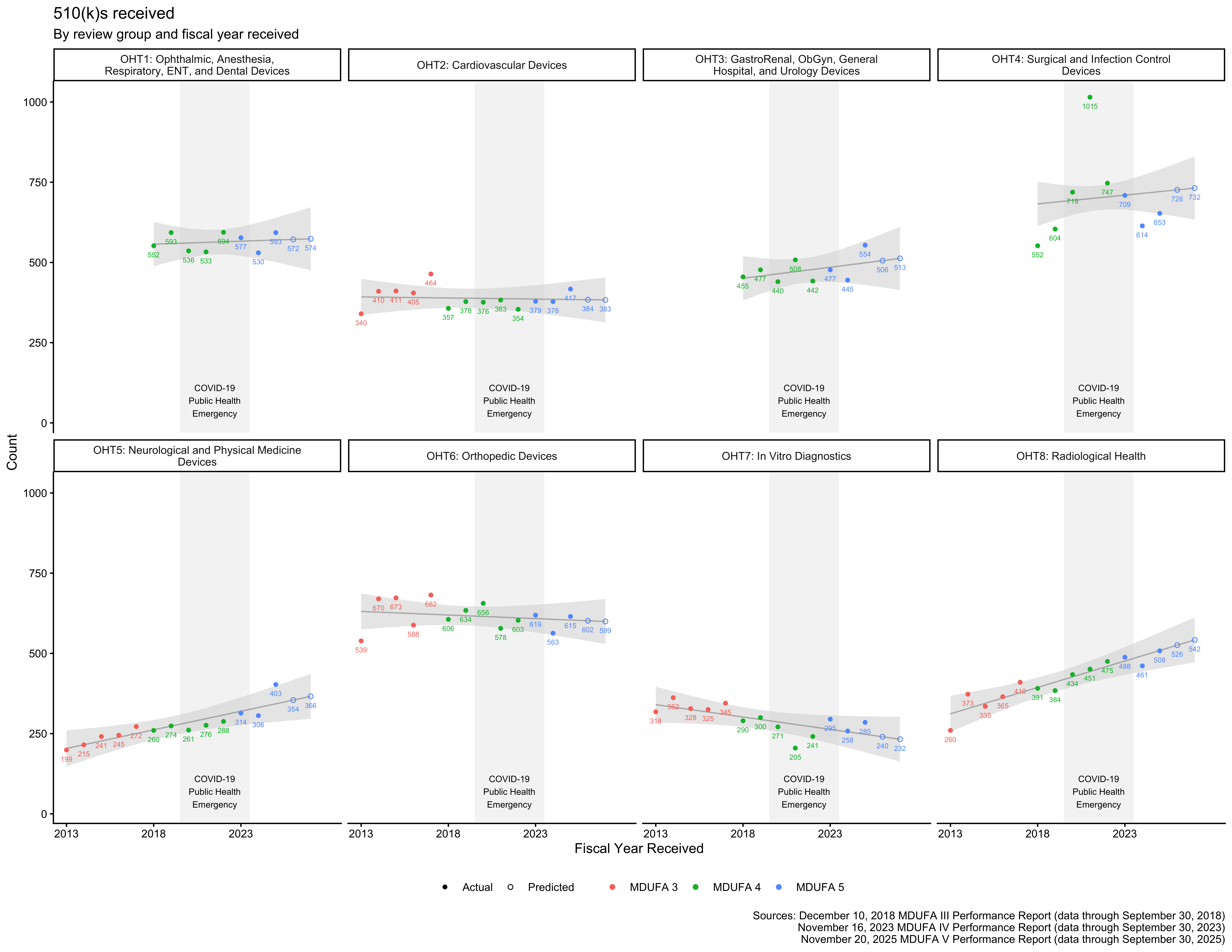 In some cases, the reorganizations took premarket review groups that already existed and were included in the MDUFA 3 reports and renamed them.3 This is essentially the case for OHT2, OHT5, OHT6, and OHT8, meaning that data for those review groups from the MDUFA 5 and MDUFA 4 reports can be aligned with data from the MDUFA 3 reports for corresponding review groups.