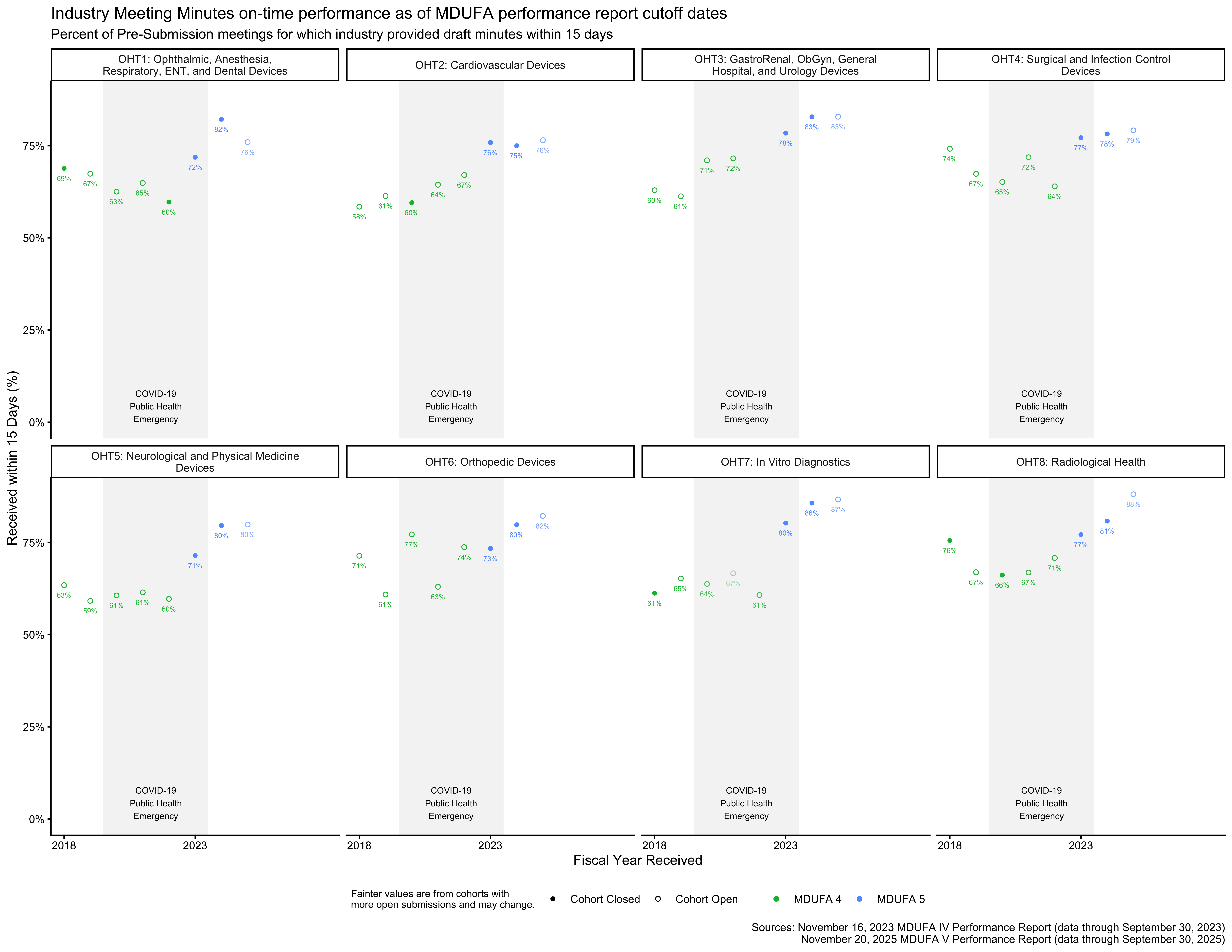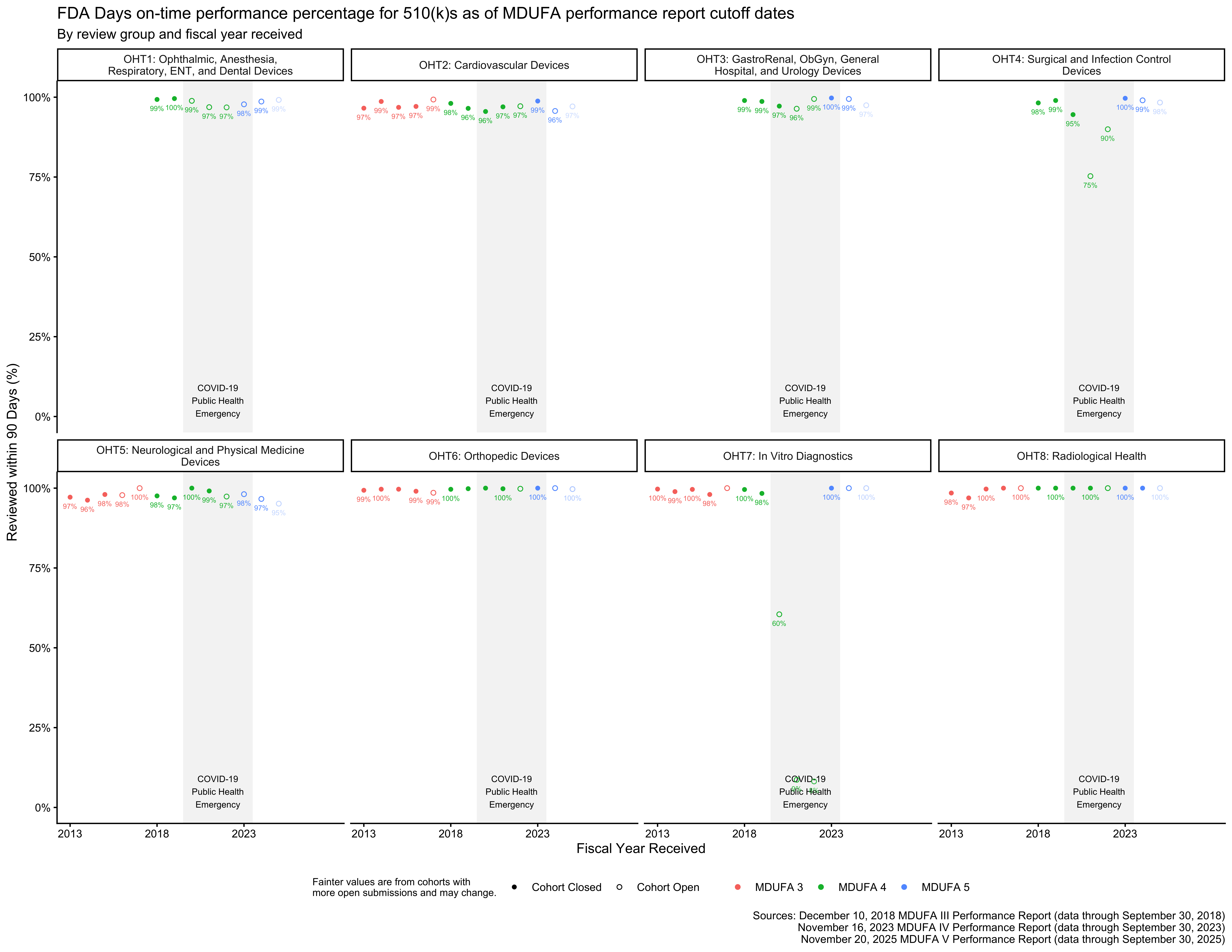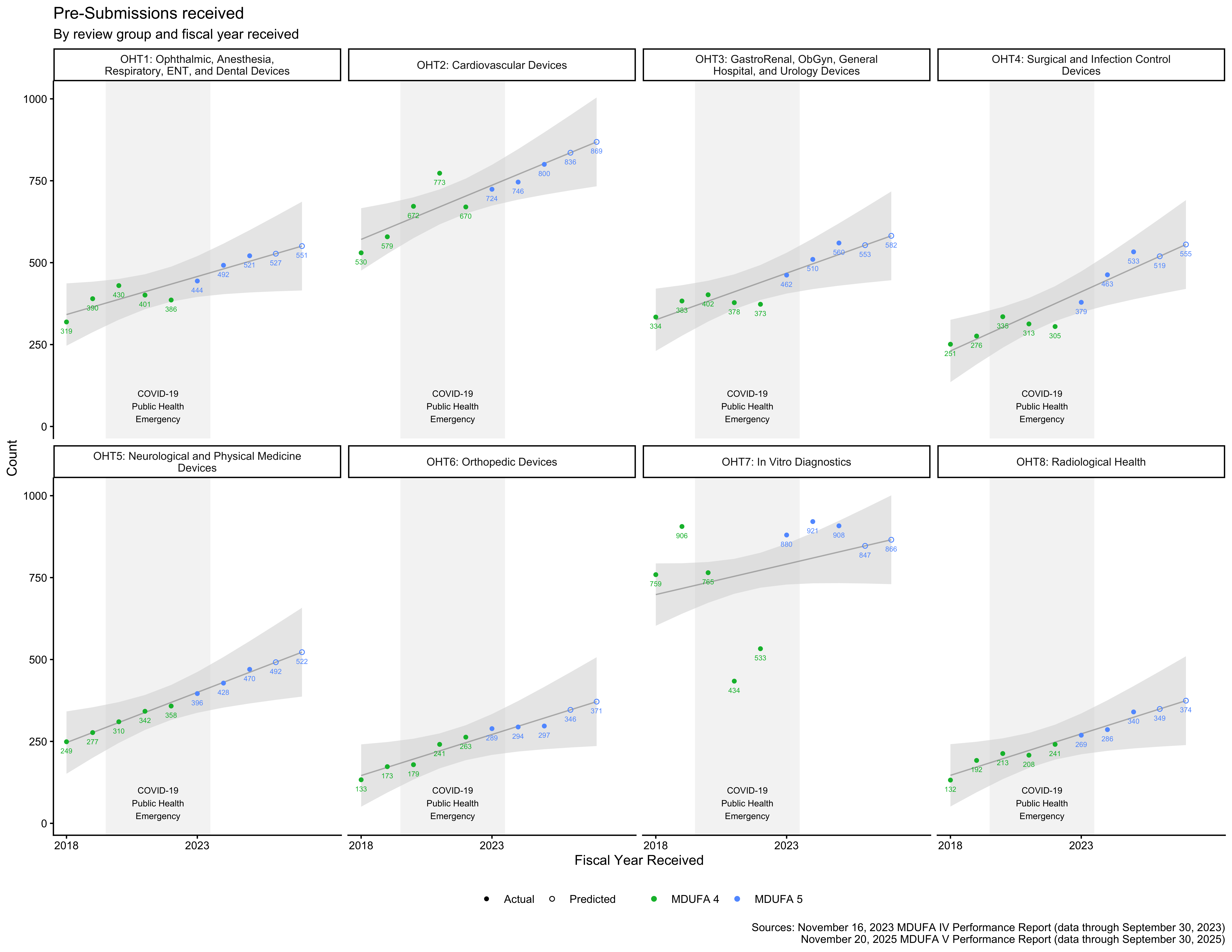 In some cases, the reorganizations took premarket review groups that already existed and were included in the MDUFA 3 reports and renamed them.3 This is essentially the case for OHT2, OHT5, OHT6, and OHT8, meaning that data for those review groups from the MDUFA 5 and MDUFA 4 reports can be aligned with data from the MDUFA 3 reports for corresponding review groups.