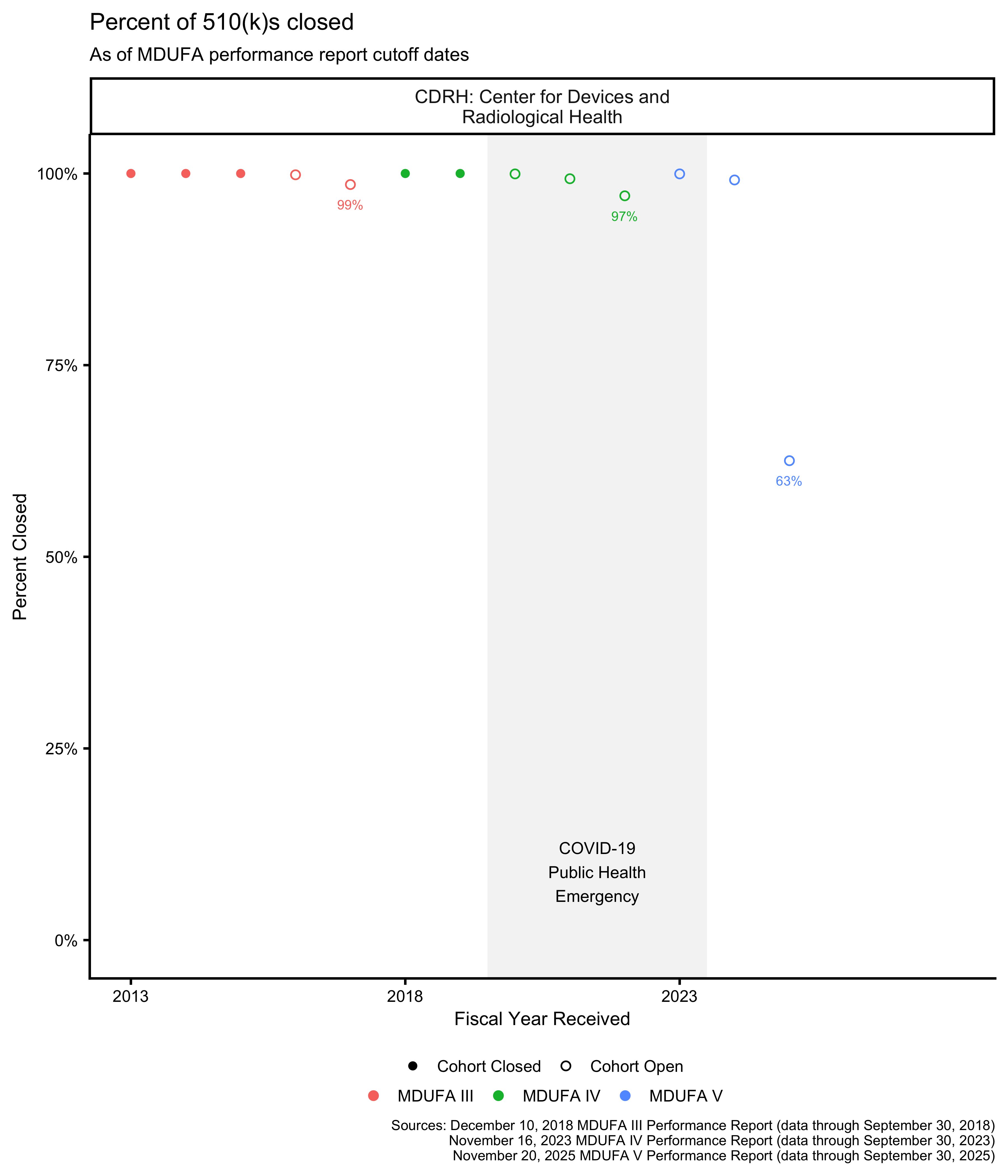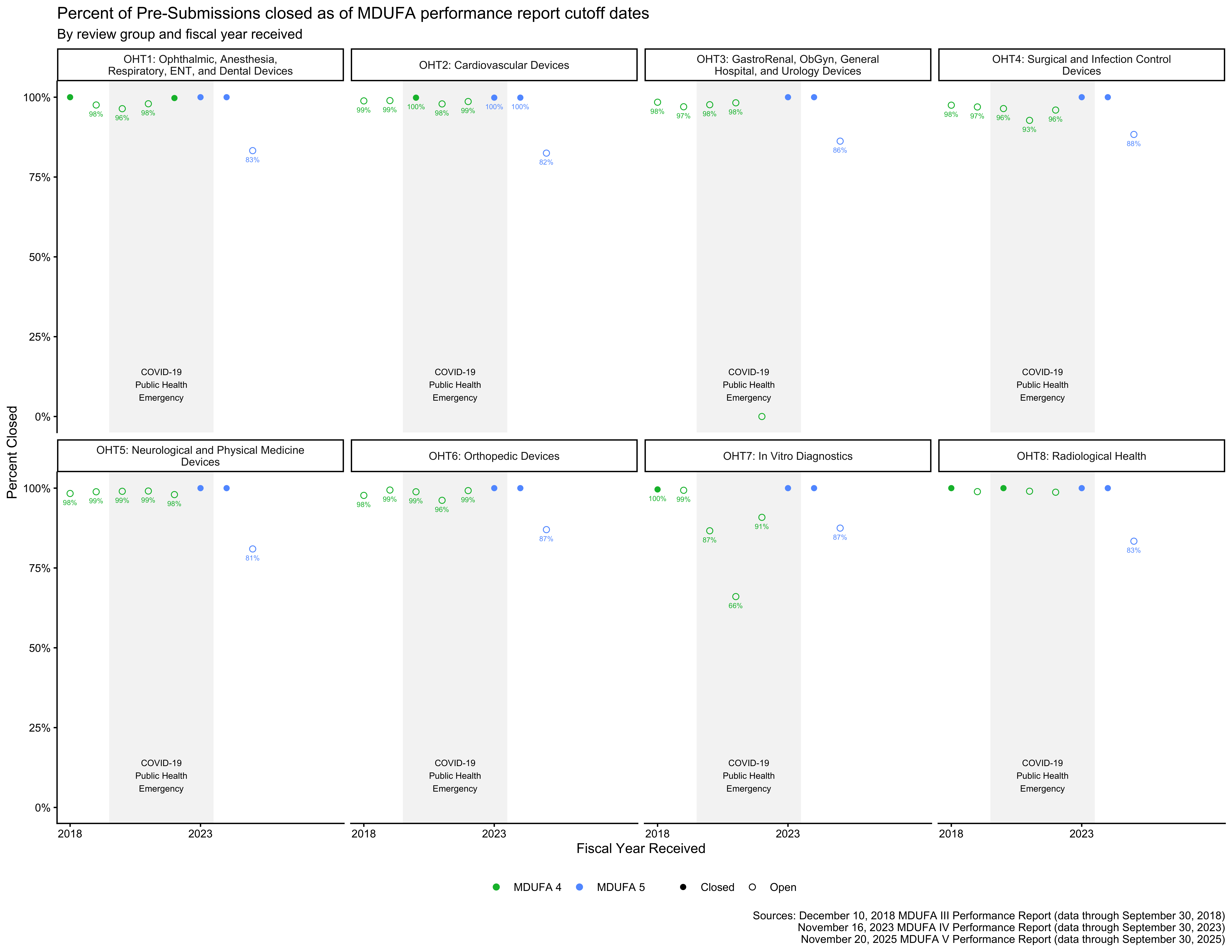 - MDUFA V: Closure = (Accepted − Non-MDUFA Action − Pending) ÷ (Accepted − Non-MDUFA Action)