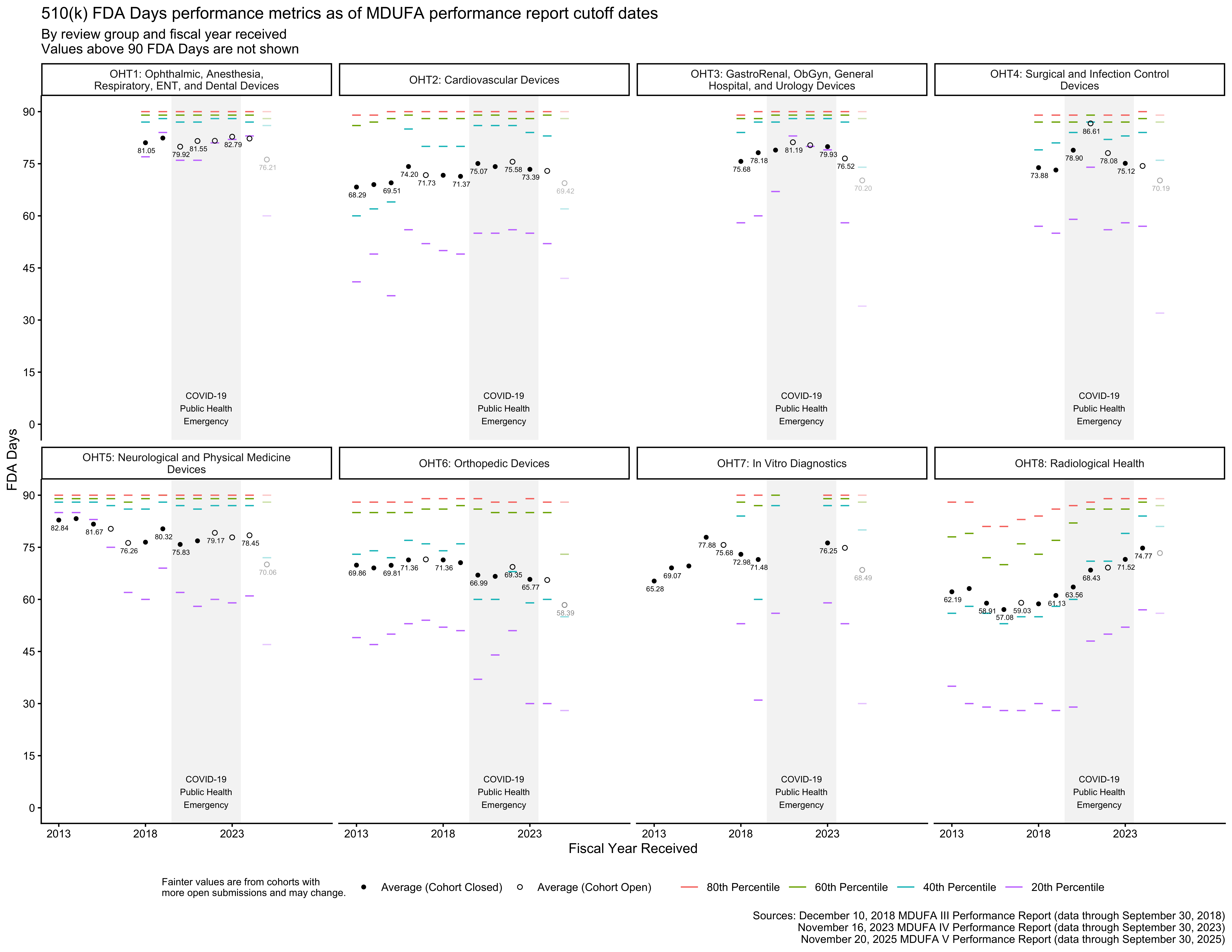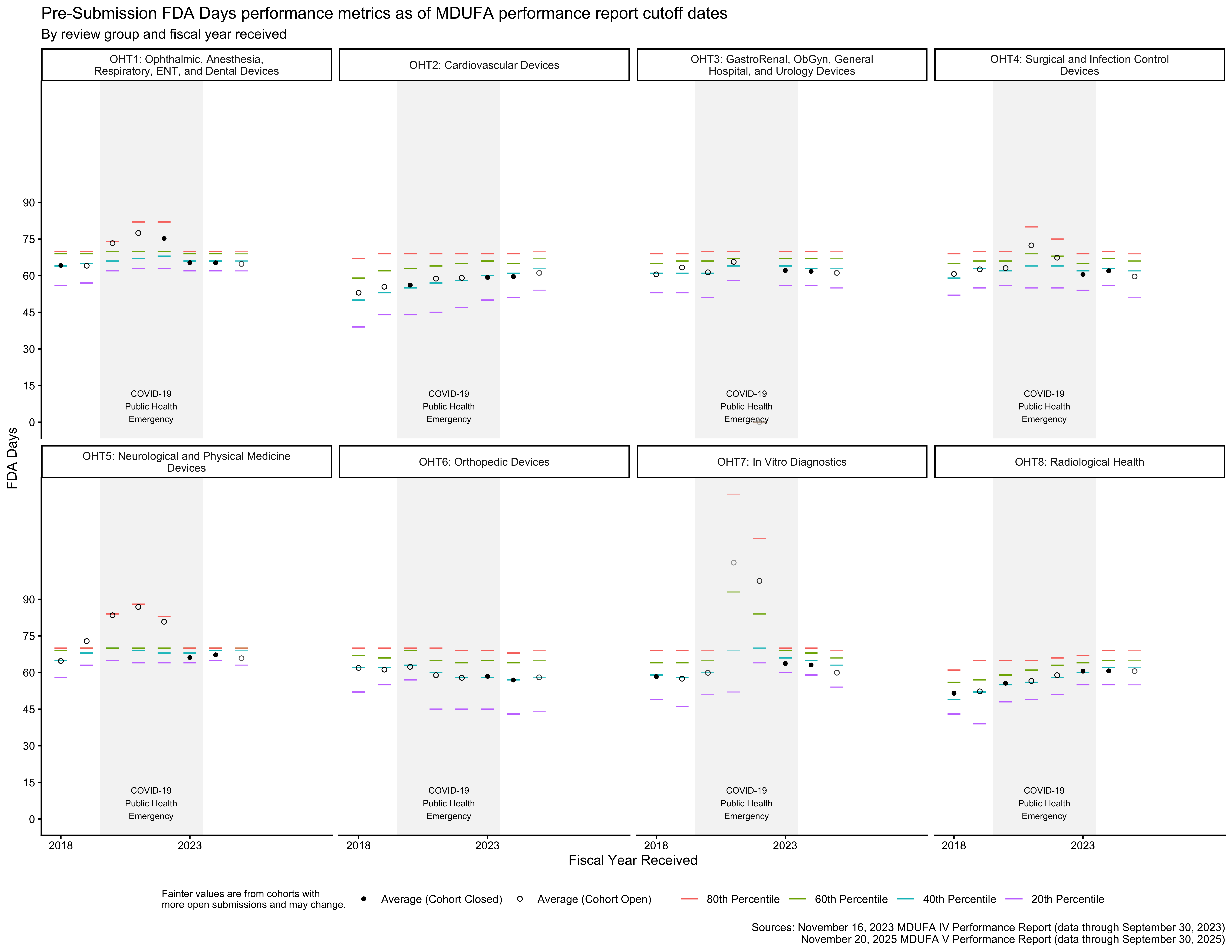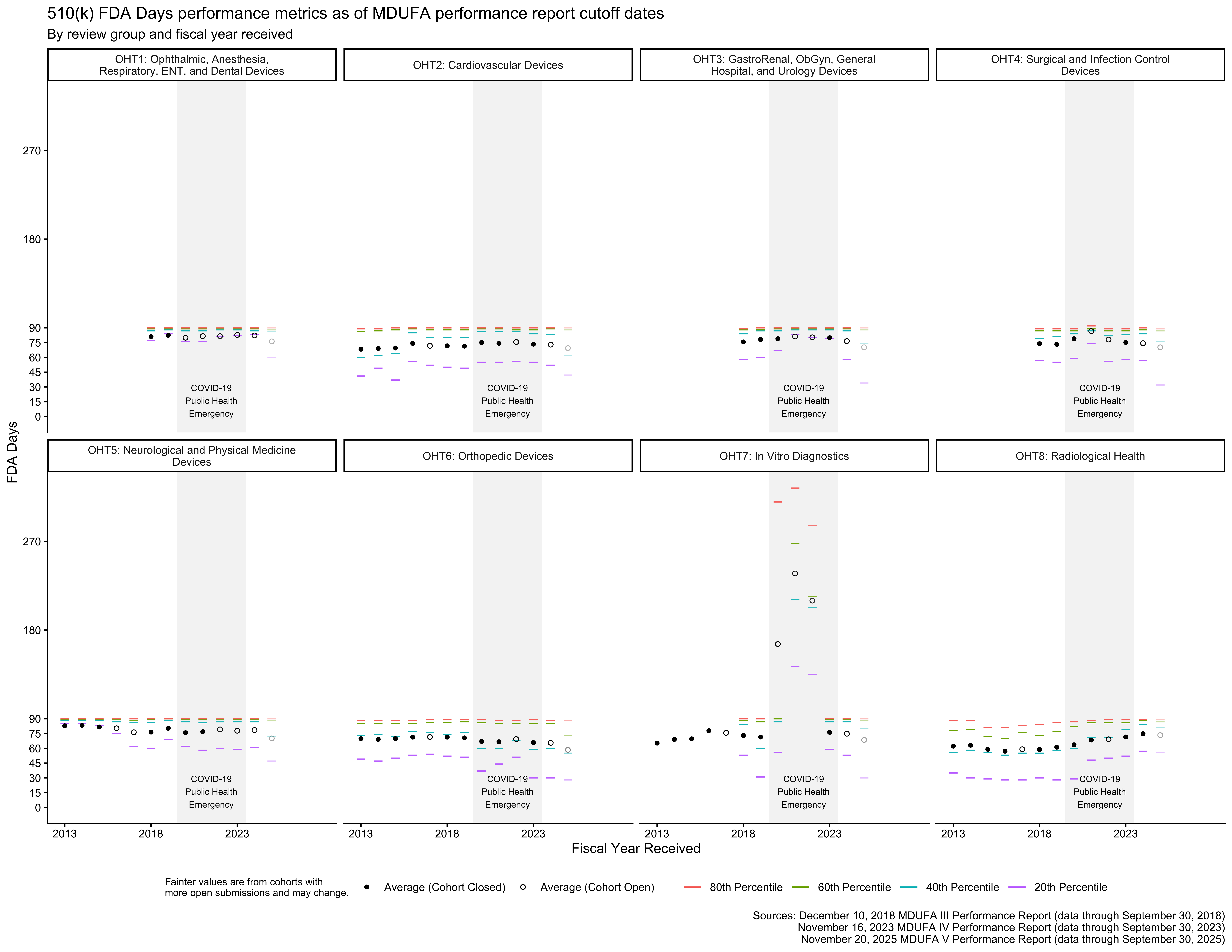 MDUFA 3 data is included for some review groups in the figures below and is not included for others. This is a result of reorganizations at the FDA. A major reorganization occurred on September 30, 2019, and a subsequent, smaller reorganization occurred later.