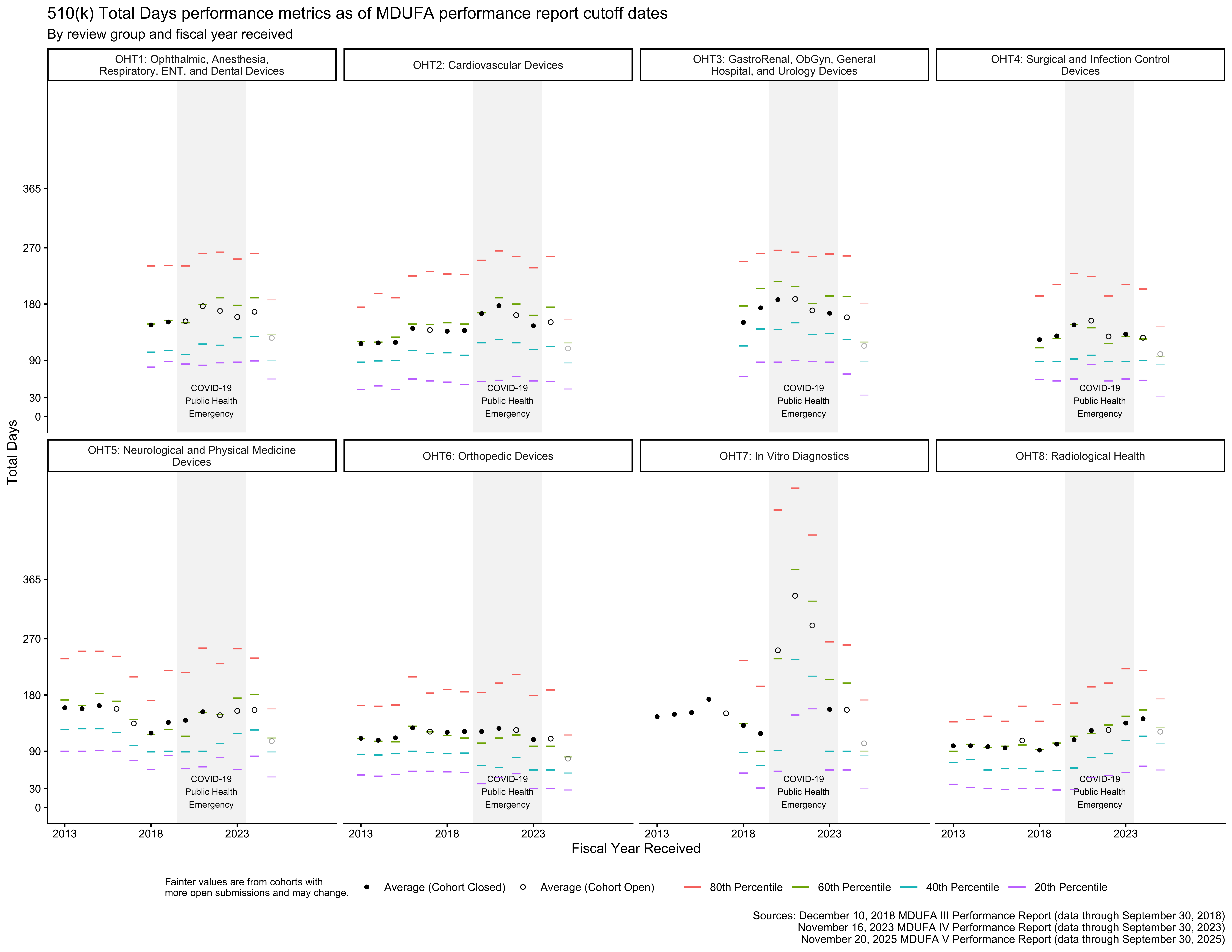 The FDA provides visualizations of many 510(k) program performance metrics for the Center for Devices and Radiological Health (CDRH) as a whole, but the FDA does not provide these for review groups within CDRH. [3, pp. 111–118] This post provides visualizations for OHT1 through OHT8 and CDRH overall.