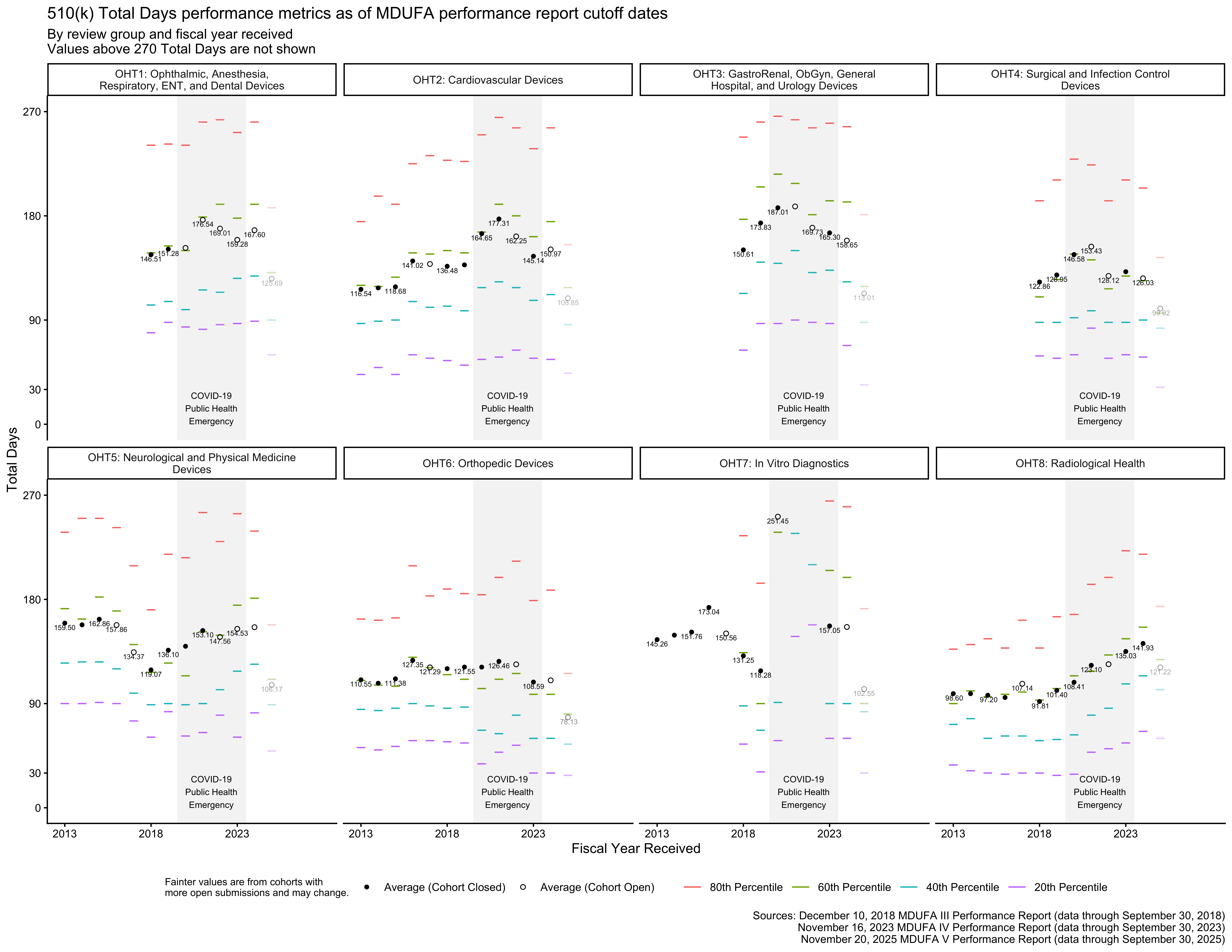 These complex techniques can be difficult to interpret. I favor looking at recently closed decision cohorts instead. Metrics similar to the Total Days metrics in the MDUFA reports can be calculated for cleared 510(k) receipt and decision cohorts using the FDA’s public 510(k) database. You can access this from R using the fdadata package, and I’ve also built a free web app you can use to explore clearance timeframes using this dataset.↩︎The reorganizations had other impacts as well, but this post is focused on their implications for MDUFA performance metric data.↩︎