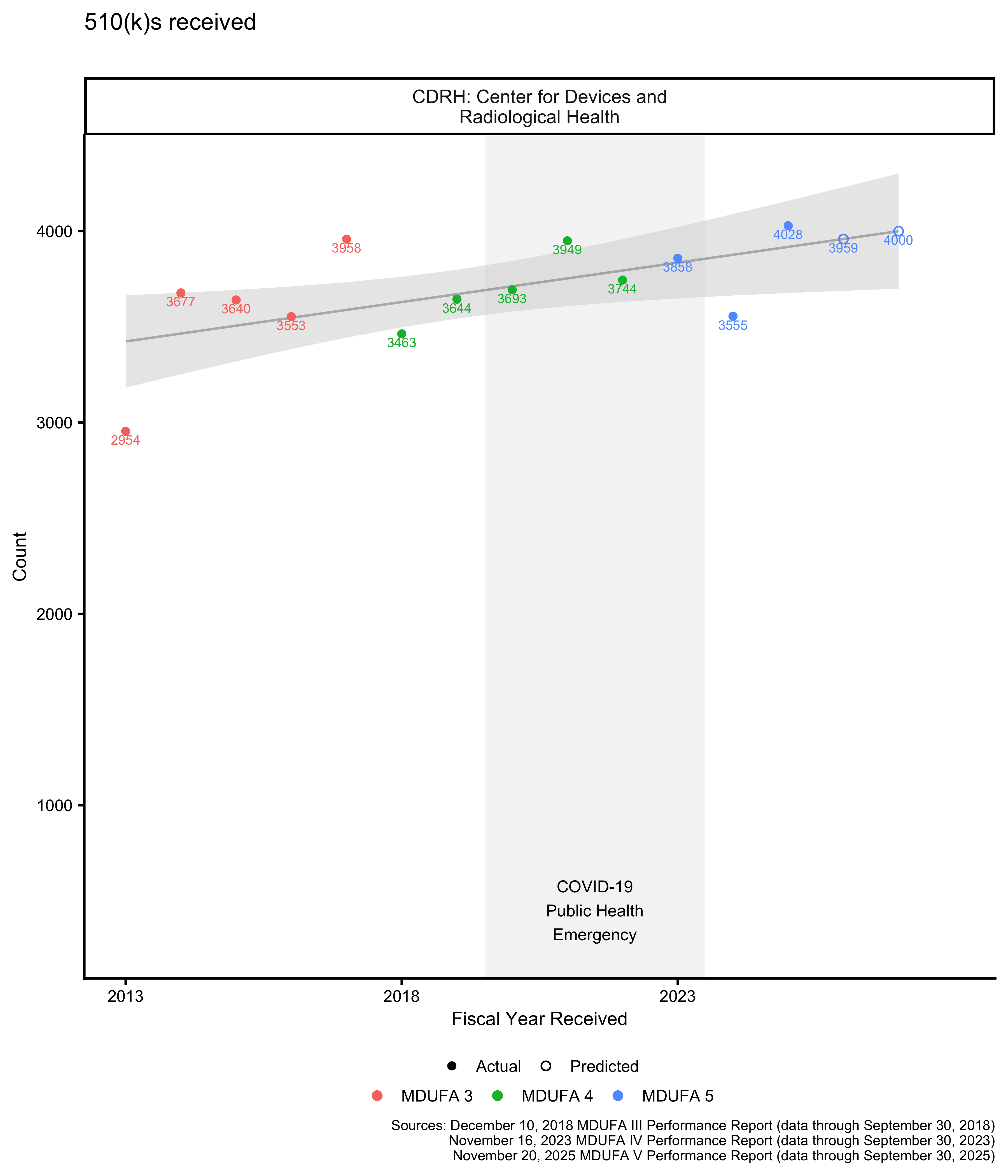 The plots in this post are based on the information in the December 10, 2018 MDUFA 3 report, the November 16, 2023 MDUFA 4 report, and the November 20, 2025 MDUFA 5 report. [1] [2] [3]
