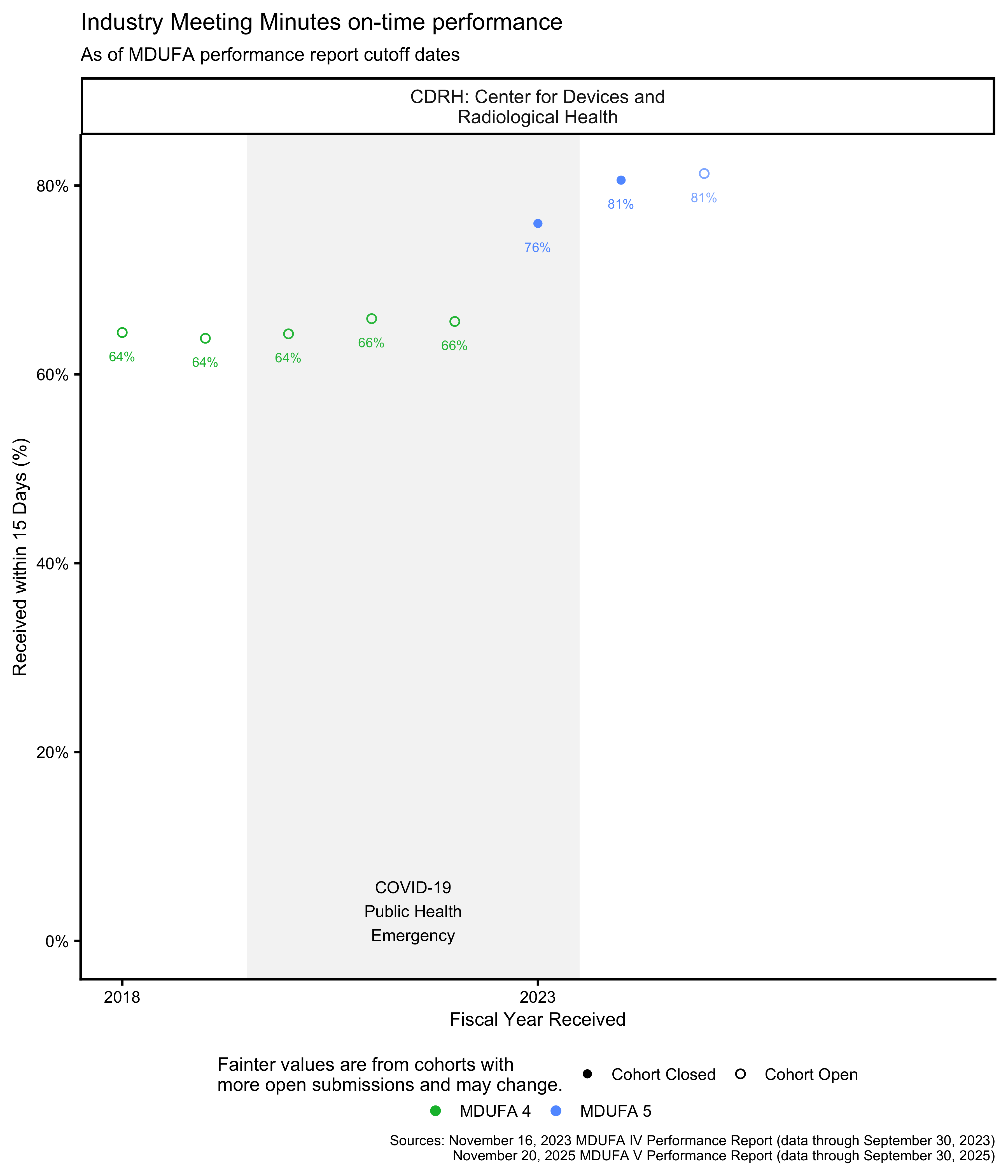 While this post can help you understand how the FDA performed on closed receipt cohorts from past years, the MDUFA reports and this post will not provide you with much useful information about how things are going at the FDA right now, and data from open receipt cohorts should be interpreted with caution.