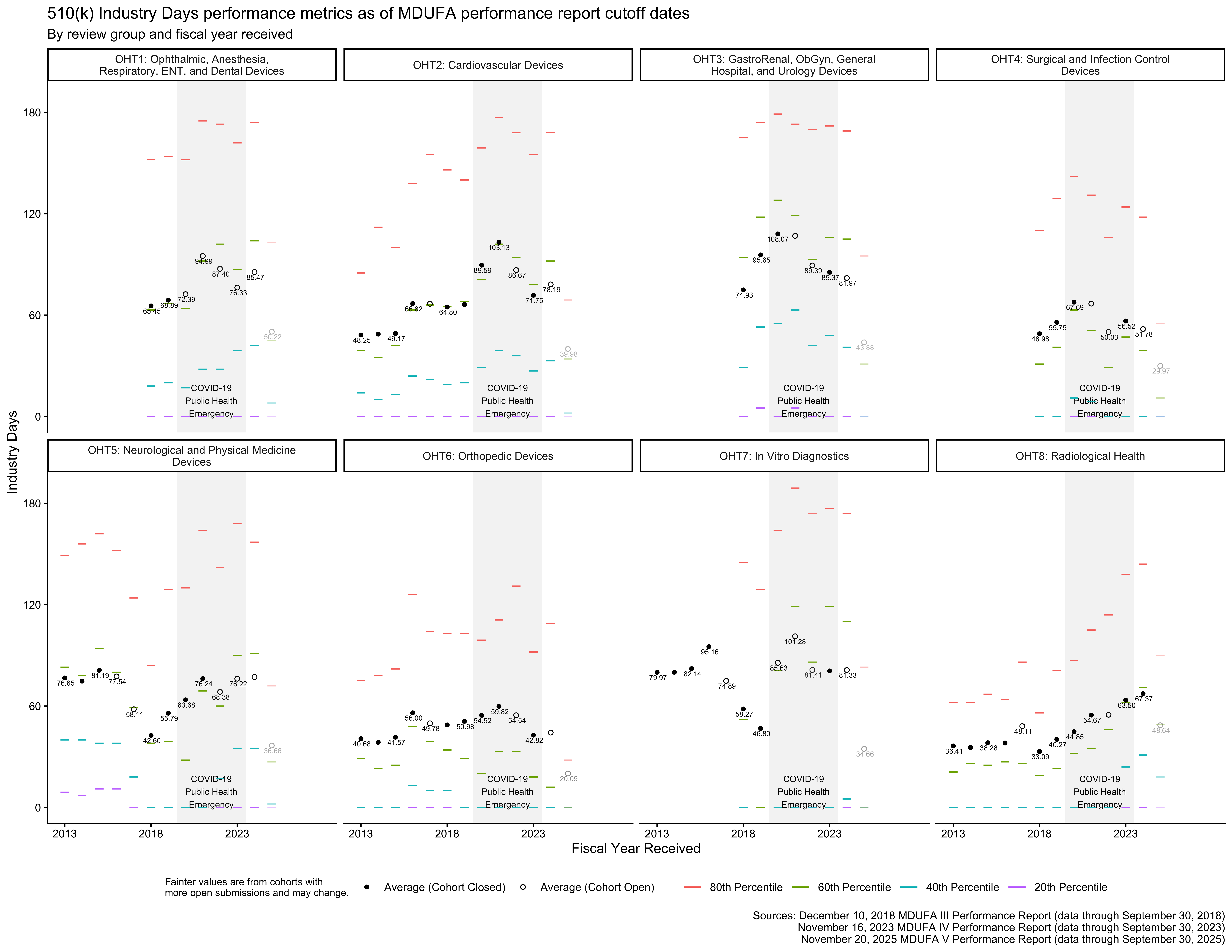 In some cases, the reorganizations took premarket review groups that already existed and were included in the MDUFA 3 reports and renamed them.3 This is essentially the case for OHT2, OHT5, OHT6, and OHT8, meaning that data for those review groups from the MDUFA 5 and MDUFA 4 reports can be aligned with data from the MDUFA 3 reports for corresponding review groups.