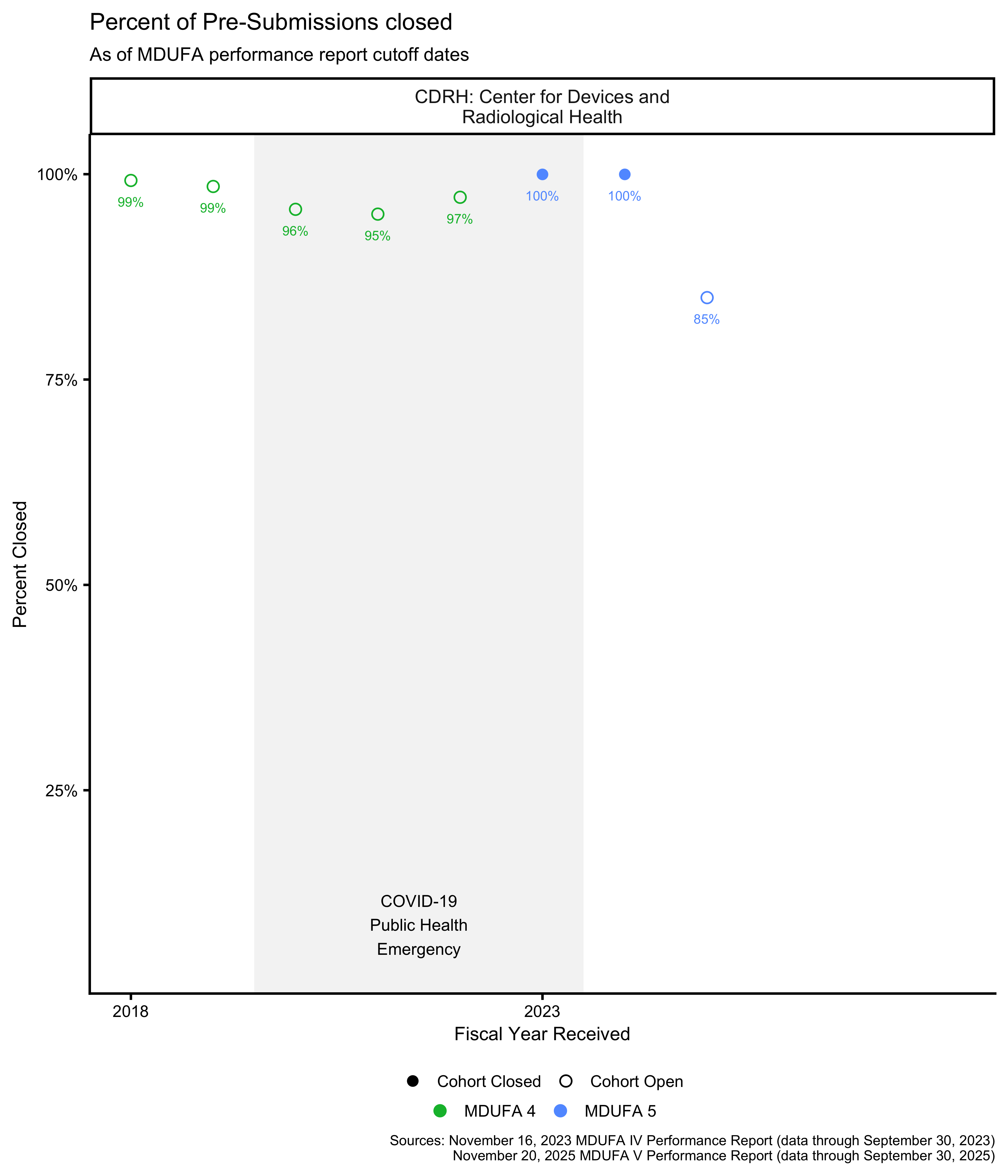 Unlike 510(k) submissions, the FDA’s MDUFA performance reports do not include a pre-calculated cohort closure percentage for Pre-Submissions. The closure percentages shown here are calculated from the available metrics using different formulas for each MDUFA period: